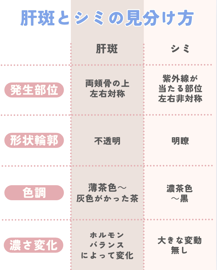 | 項目 | 肝斑が出やすい人・要因 | シミが出やすい人・要因 |