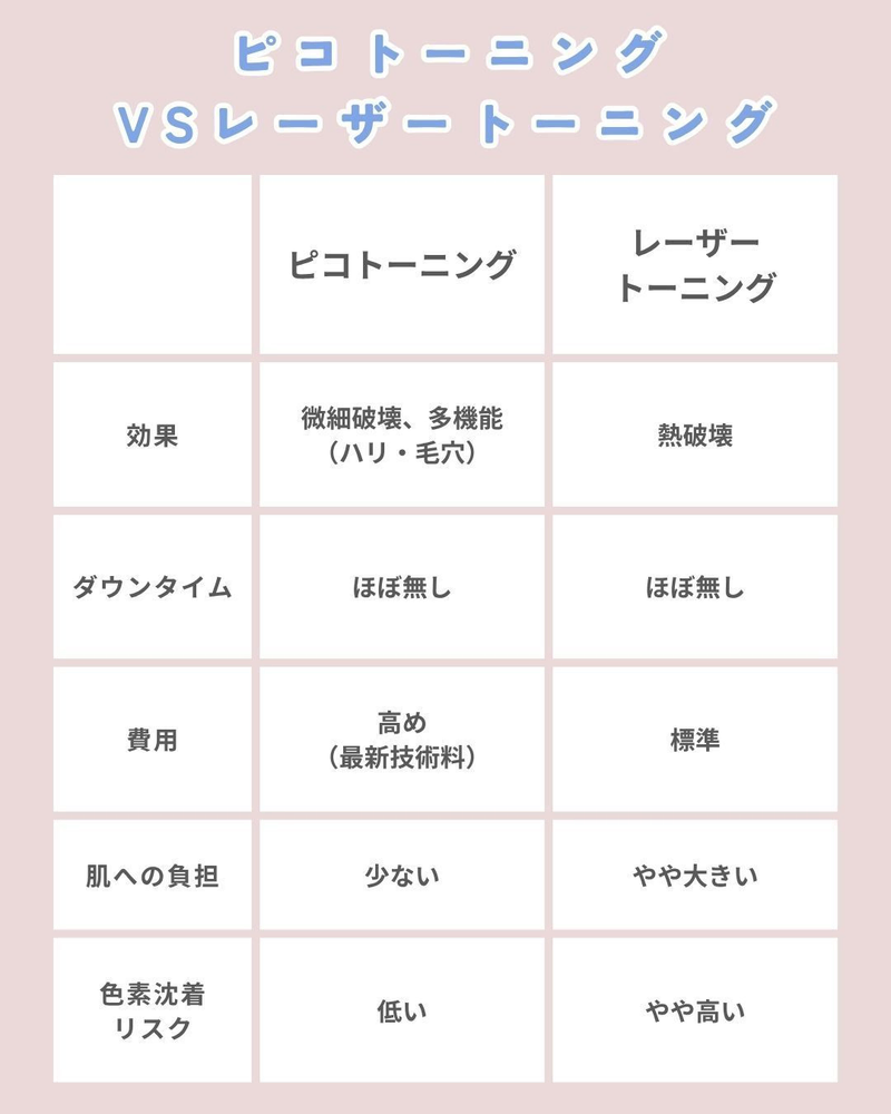 効果の違いから、 ピコトーニング は 肌への優しさと効率 において優位性があり、特におすすめできます。