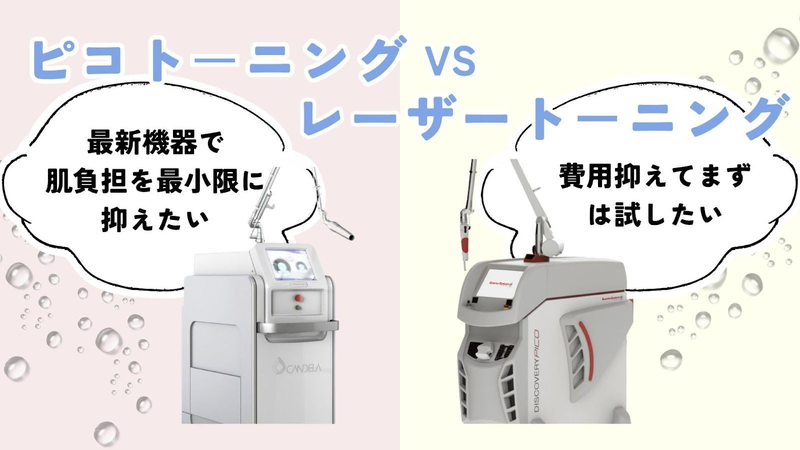 一般的に、 ピコトーニング は最新の技術で 肌への負担が少なく、ダウンタイムが短い 傾向があり、 レーザートーニング は長年の実績があり、 肌のハリや深層への作用も期待できる といった特徴があります。