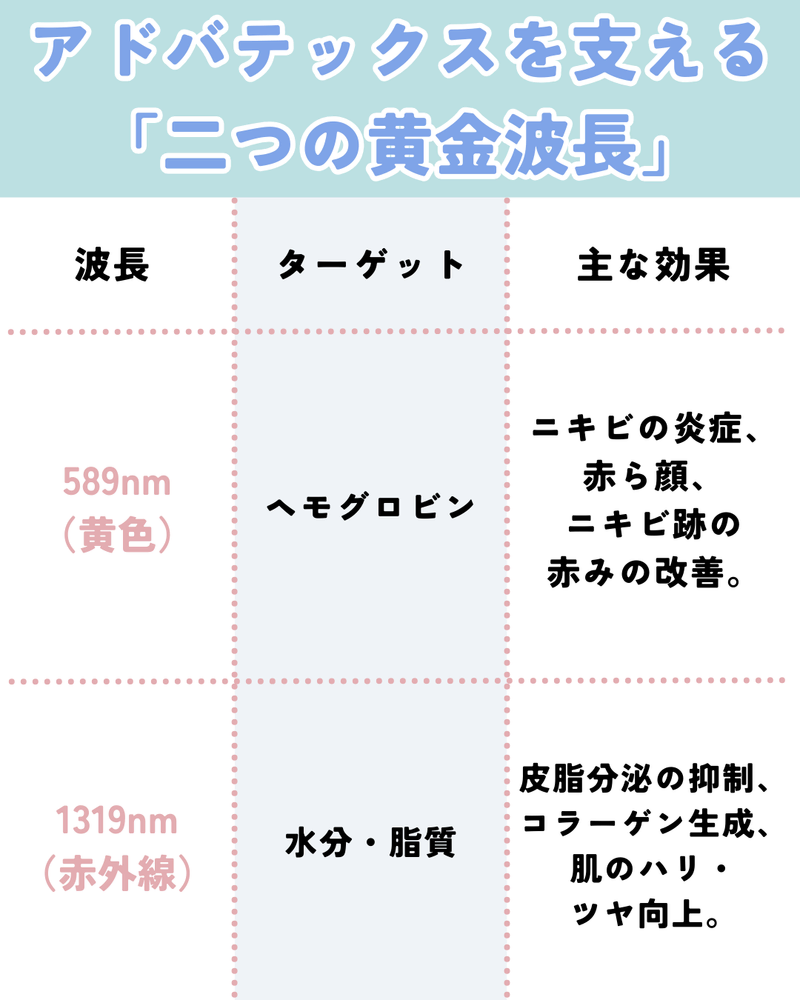 アドバテックスは、それぞれの波長が異なるターゲットに作用し、複合的な肌トラブルを解決します。