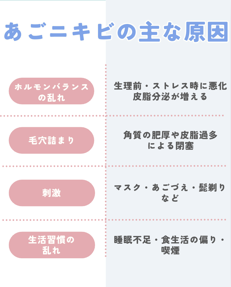 ホルモンバランス・毛穴詰まり・生活習慣・刺激 といった複数の要因が重なって起こります。