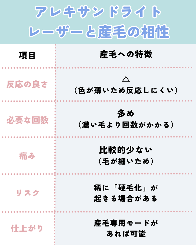 このように、アレキサンドライトレーザーで産毛を完璧に無くすには、 濃い毛の脱毛に比べて「少し工夫や回数が必要」 になるのが現実です。