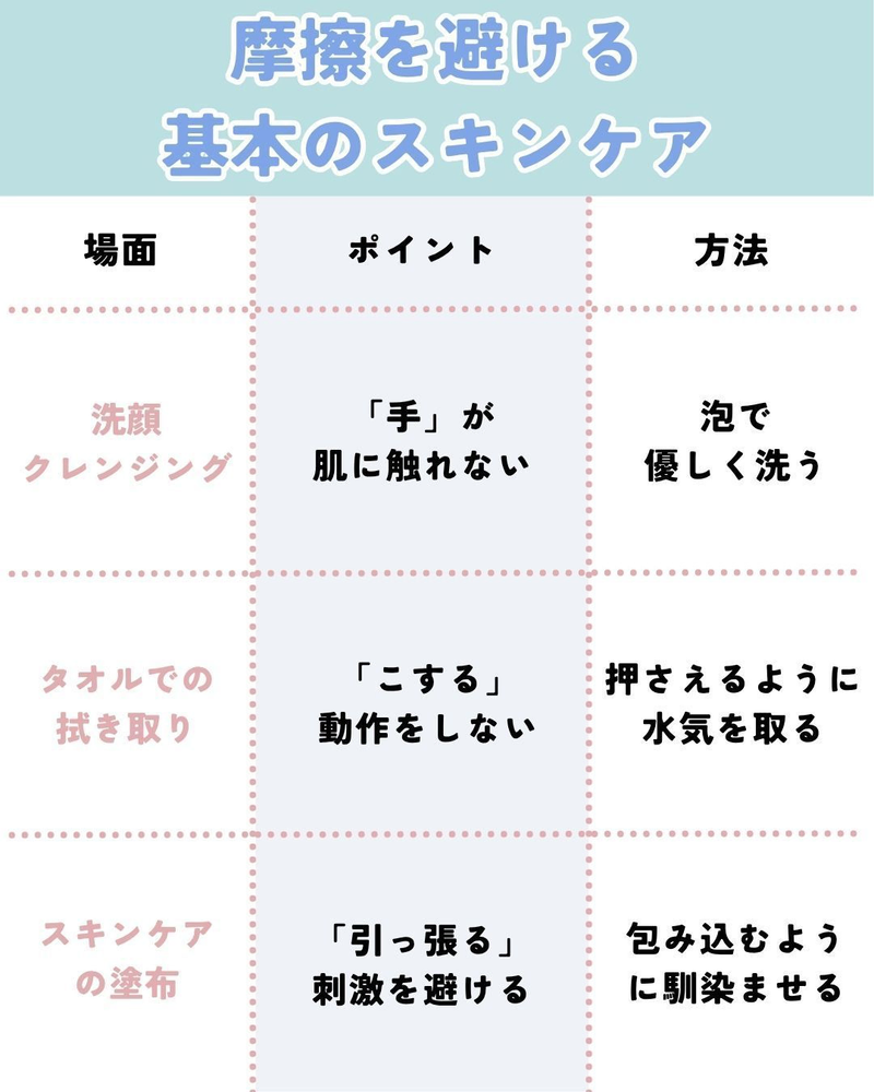 肌に極力触れない、触れる際は優しく包み込むように、という意識を徹底することが改善への第一歩です。
