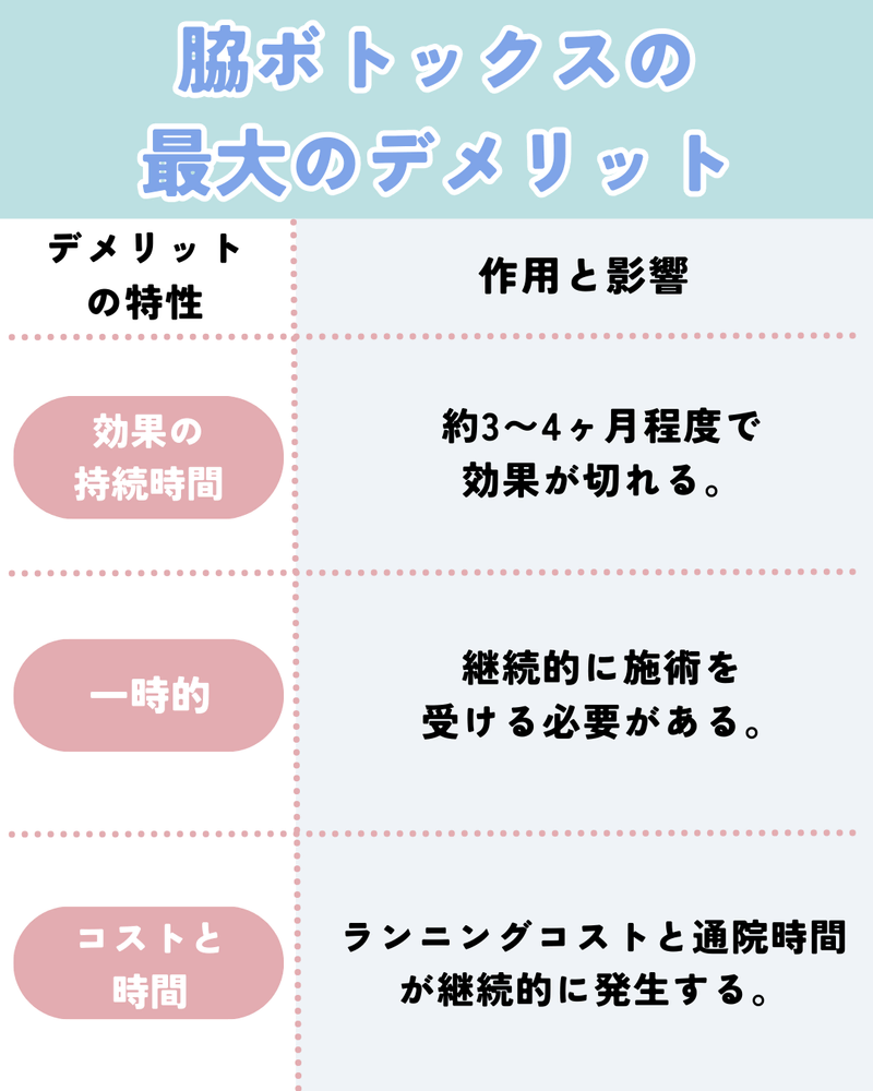ボトックス注射は、効果が 永続的ではない ことが最大のデメリットです。