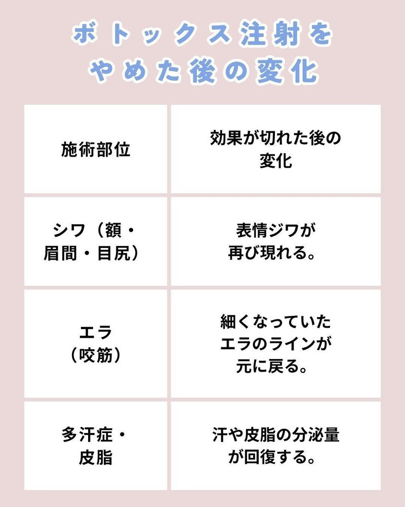 ボトックス注射をやめても、 シワや老化が悪化する心配はありません。