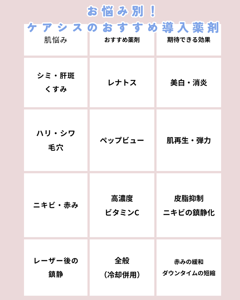 ケアシスでは、主に「美白系」「成長因子系」「高濃度ビタミン系」などの薬剤が使われます。