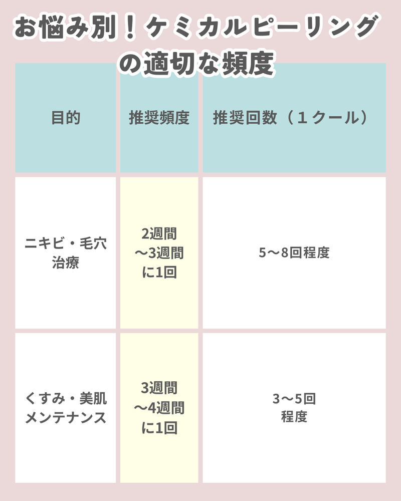 ケミカルピーリングの適切な頻度は、 肌の目的や使用する薬剤の種類 によって異なります。