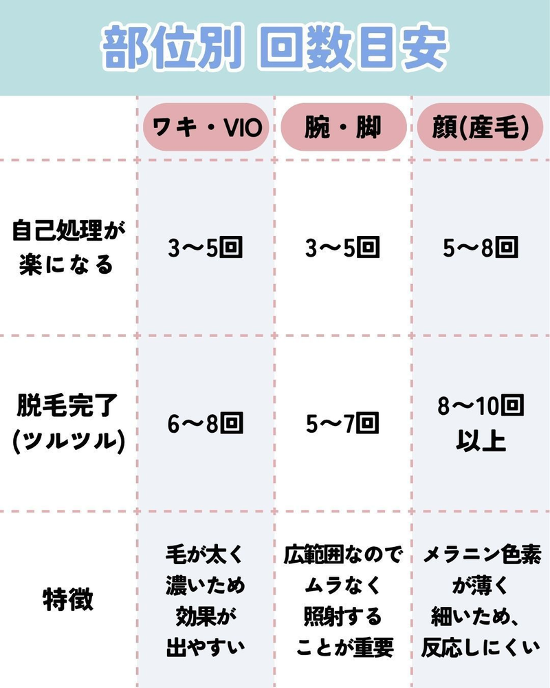 | 部位 | 毛が薄くなる ・自己処理が 楽になる回数 |