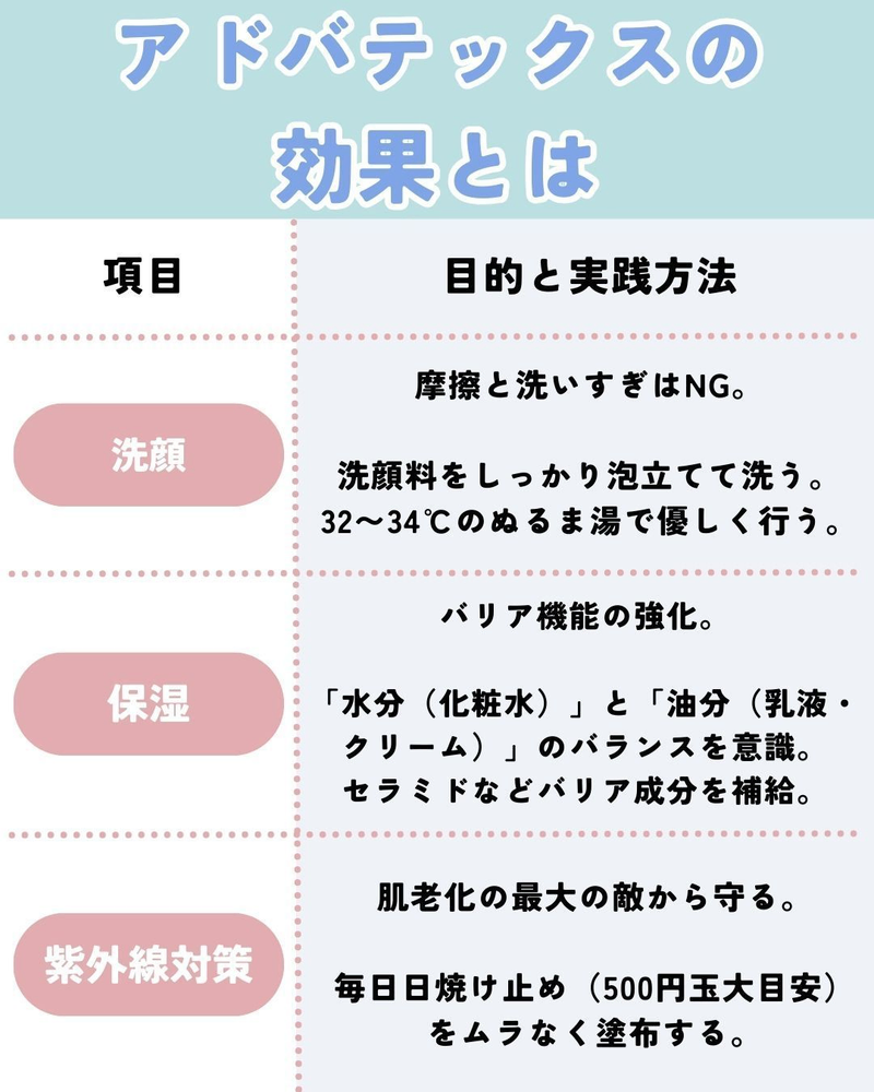 ・化粧品の数を減らし、 高保湿かつ低刺激 なものに切り替え、肌バリア機能の回復をサポートします。