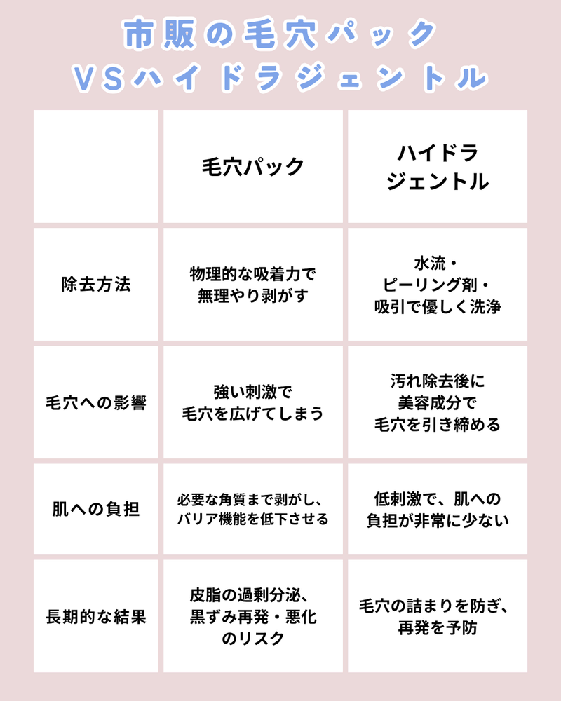 負担の大きい 「毛穴パック」と効果的な「ハイドラジェントル」の比較