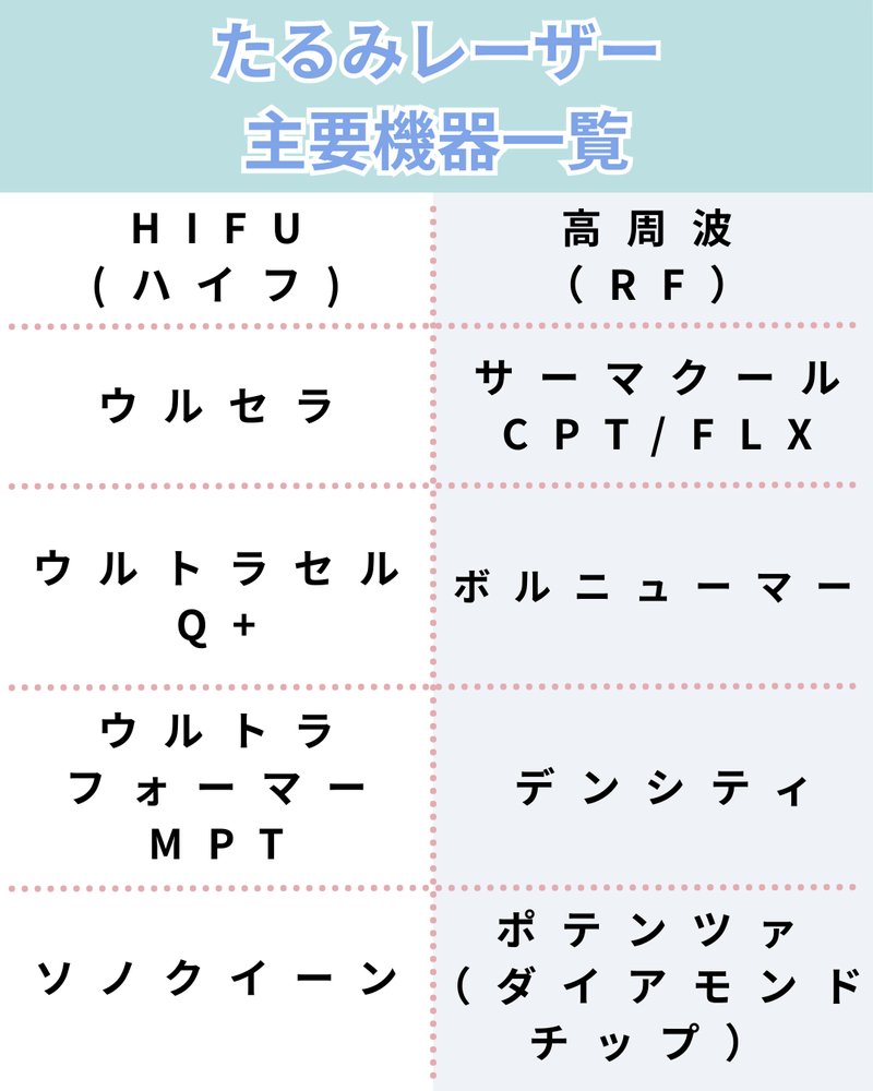 | ウルセラ | 「HIFUのゴールドスタンダード」 。 米国FDA認可。 出力が最も高く、視覚化されたエコー画面で 層を確認しながら精密に照射可能。 効果と持続性が最強クラス。 |