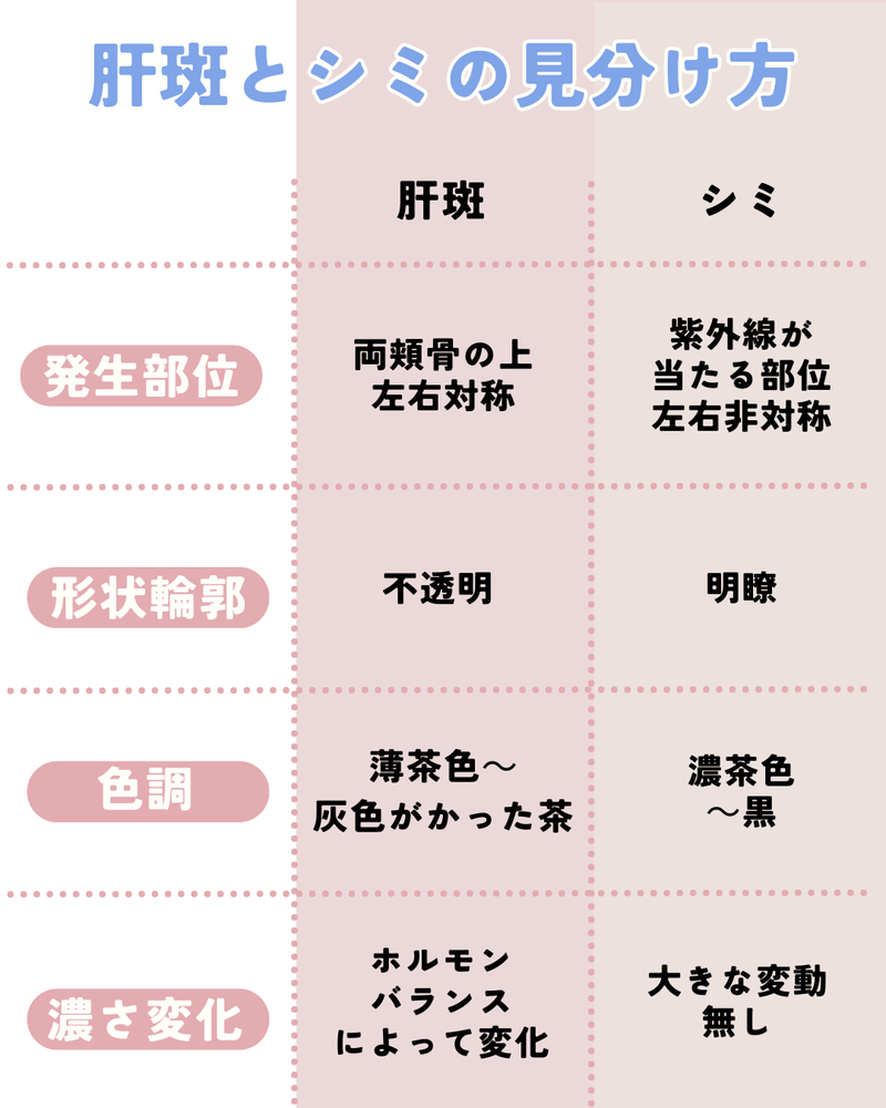 | 項目 | 肝斑が出やすい人・要因 | シミが出やすい人・要因 |