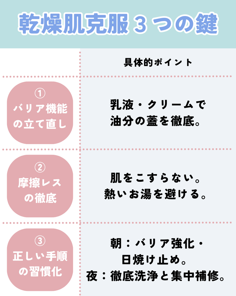 ・ 最優先事項 :一時的な水分補給ではなく、 セラミド を中心とした「保湿の三銃士」で肌のバリア機能を強化しましょう。