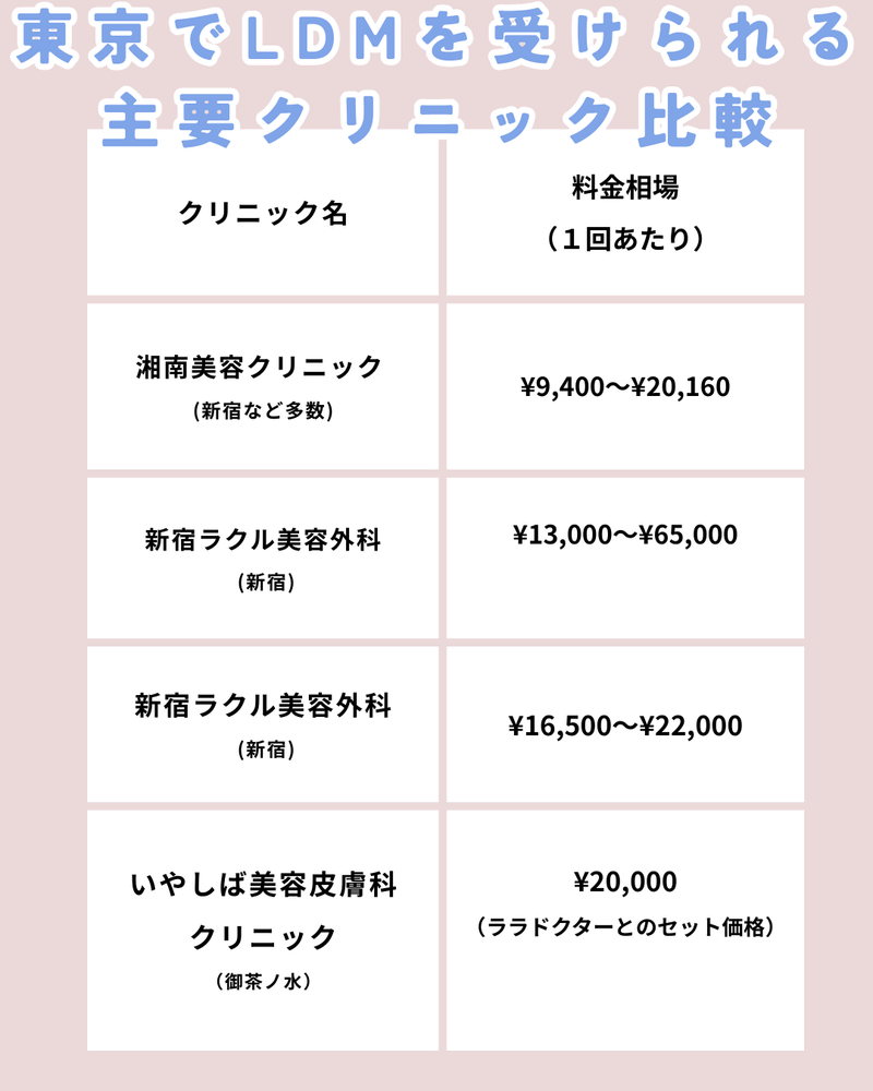 東京には多くのクリニックがありますが、ここでは特にLDMを提供しており、アクセスしやすいクリニックの料金帯と特徴をまとめます。