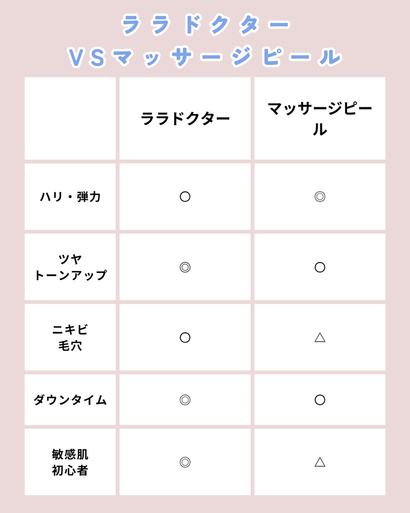 マッサージピールとララドクターは、どちらもハリとツヤをもたらす優れた施術ですが、そのアプローチは大きく異なります。