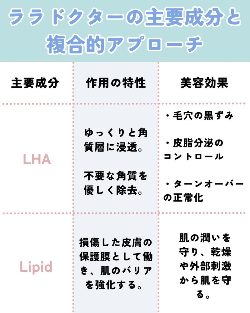 従来のピーリングが「肌の角質を剥がす」ことに主眼を置いていたのに対し、ララドクターは「肌のバリアを保護しながら、必要な成分を深層に届け、再生を促す」という、全く新しいコンセプトに基づいています。