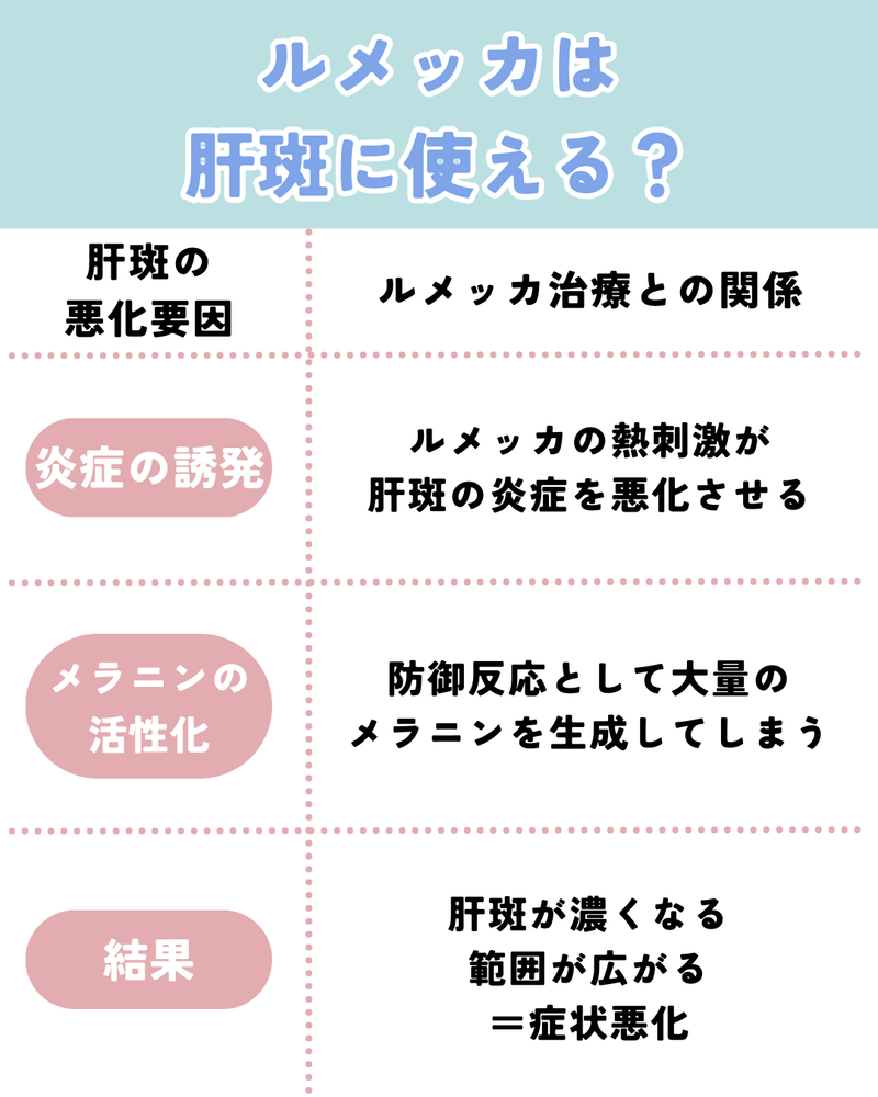 「これ一つで全てのシミが消える」と安易に期待し、ルメッカを受けると 症状を悪化させるリスク があります。