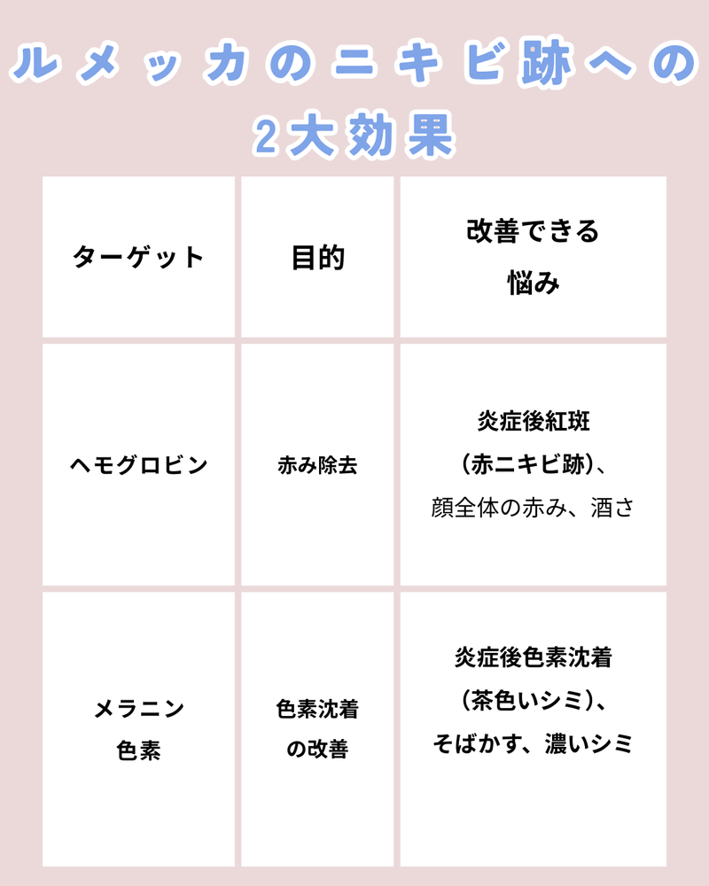 ルメッカは、ニキビ跡の主な悩みである「赤み」と「茶色いシミ」の 二つの原因に集中的にアプローチ します。