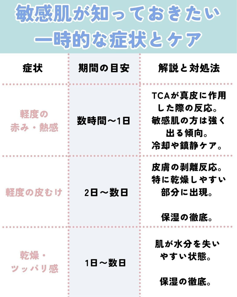 赤みや皮むけの出現は、肌が薬剤に強く反応したサインであり、特に敏感肌や乾燥肌の方 に起こりやすい症状です。