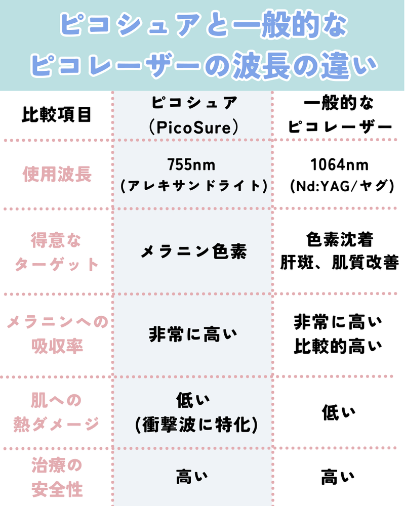 ピコシュアの最大の特徴は、一般的なピコレーザーが主に使用するヤグ波長(1064nm)ではなく、 755nmというアレキサンドライト波長 を使用している点です。