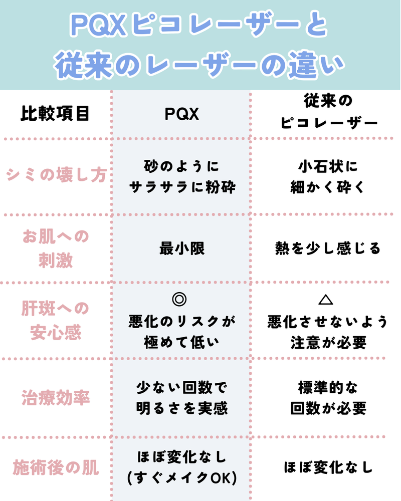 PQXピコレーザーがこれまでの治療とどう違うのか、わかりやすい言葉で比較してみましょう。