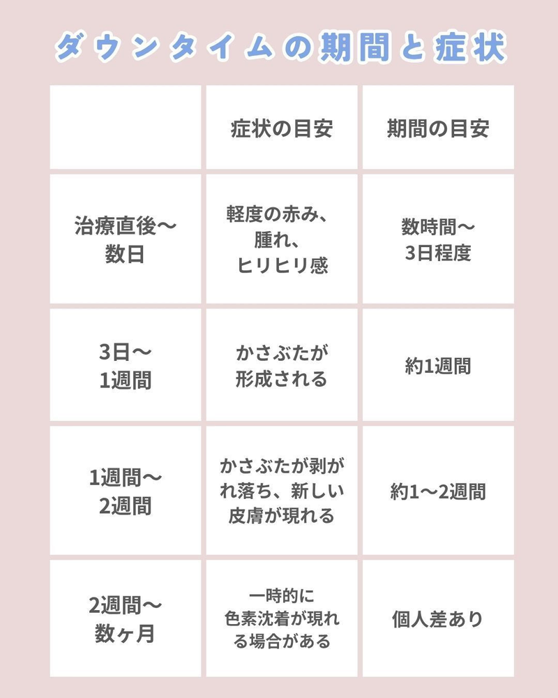 ダウンタイムとは、レーザー治療などの施術によってダメージを受けた肌が、元の状態に回復するまでの期間を指します。