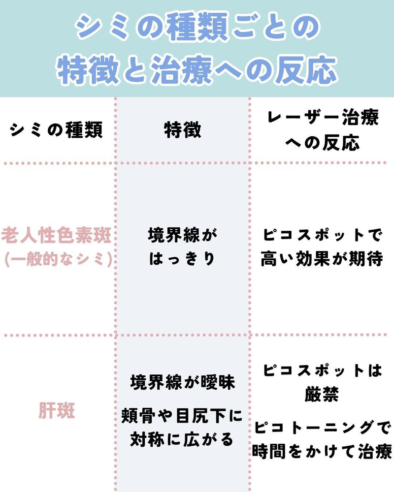 ただし、 濃くはっきりしたシミ(老人性色素斑)と肝斑が混在している場合は、まず肝斑をピコトーニングで落ち着かせた後に、濃いシミへピコスポットを照射 するという「複合的なステップ治療」が必要になります。
