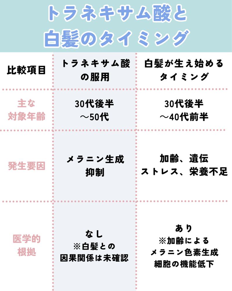 上記の表が示す通り、肝斑の悩みが顕在化し、トラネキサム酸の服用を始める時期と、 加齢による自然な白髪の増加 が始まる時期が、多くの人にとって一致してしまいます。