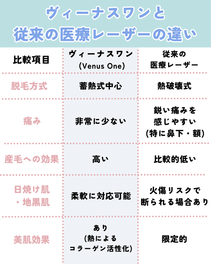 まずは、顔脱毛におけるヴィーナスワンと従来の医療レーザーの違いを表で確認しましょう。