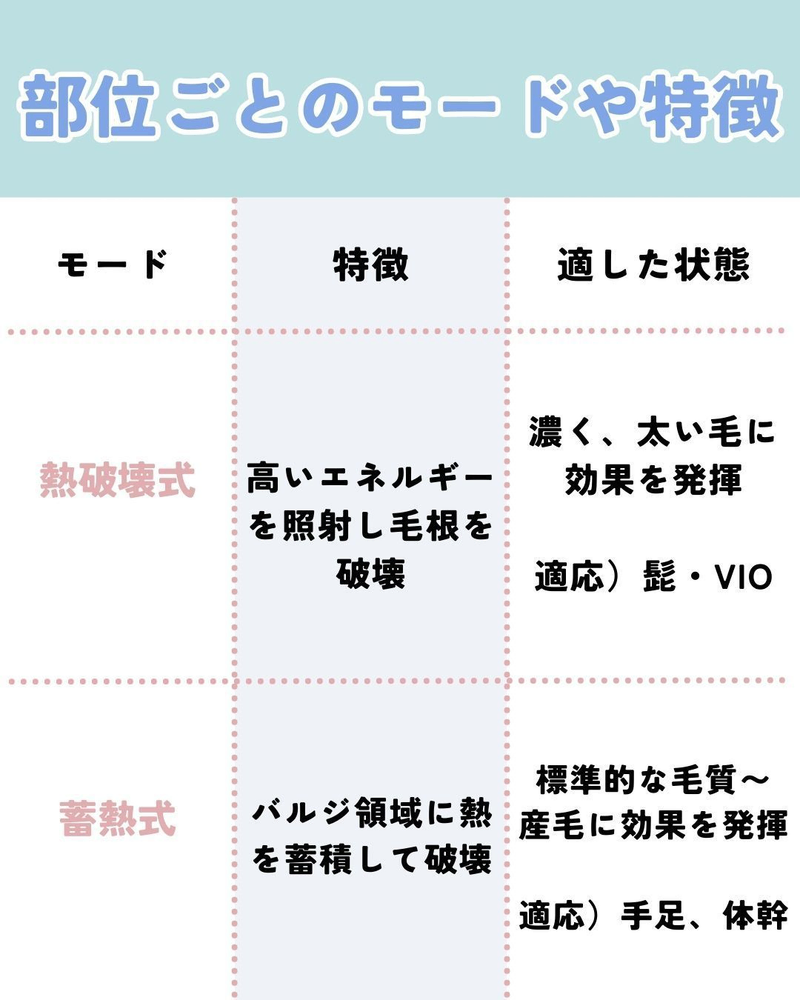 ヴィーナスワンは、脱毛方式として「熱破壊式」と「蓄熱式」の両方に対応しており、毛質の濃さや部位に合わせたモードの選択が可能となっています。