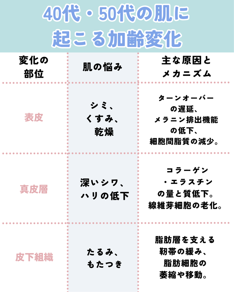 40代、50代になると、肌の変化は一層顕著になり、「シミ」「深いシワ」「たるみ」が複合的に現れます。